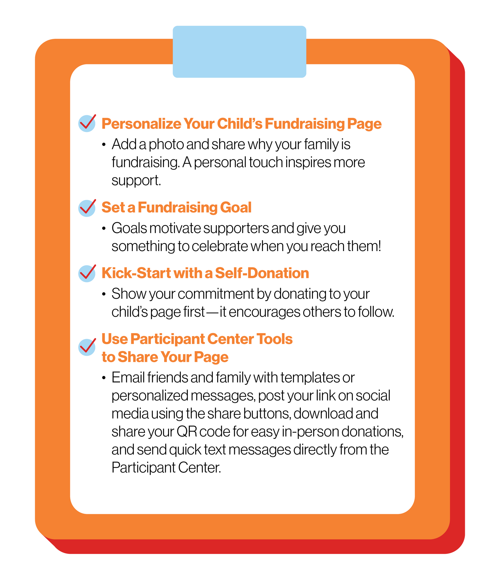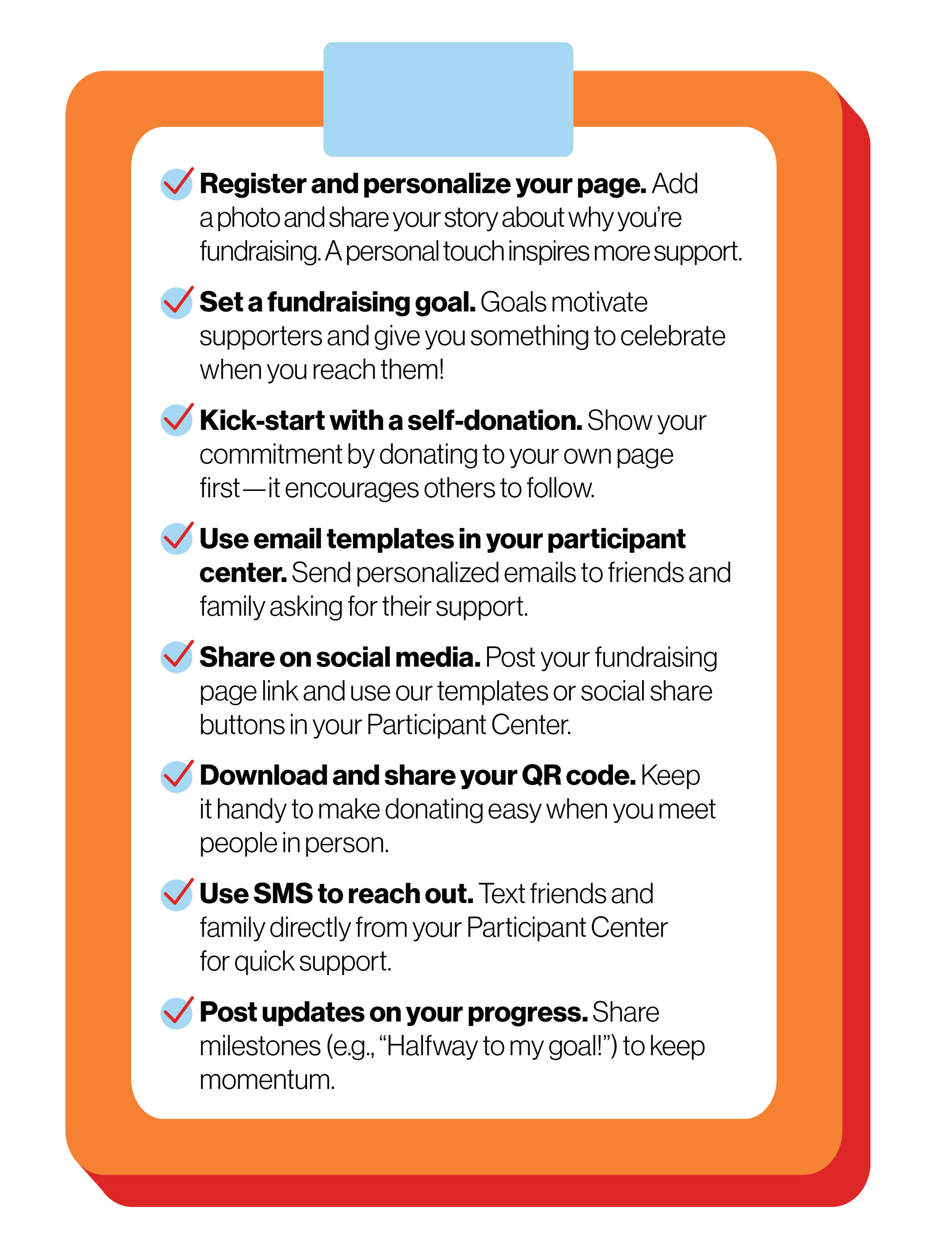 Check out these quick fundraising tips to help your family reach your goal and support life‑saving research. Every dollar counts!