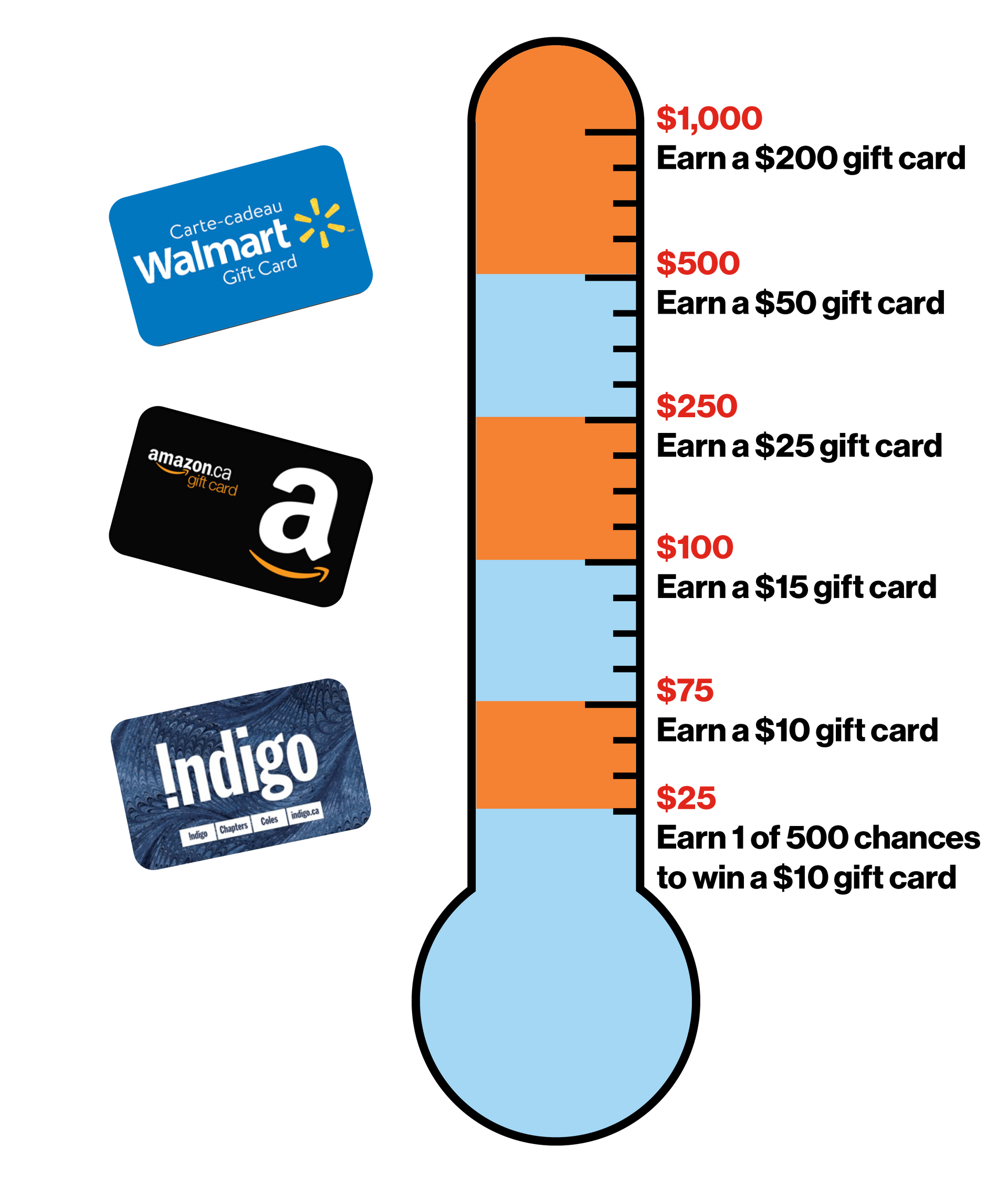 As a heartfelt thank you for your support, you will receive an online gift card* of your choice from one of the following retailers, based on your fundraising achievements: Indigo, Amazon, or Walmart. Check out other ways to win by clicking here!